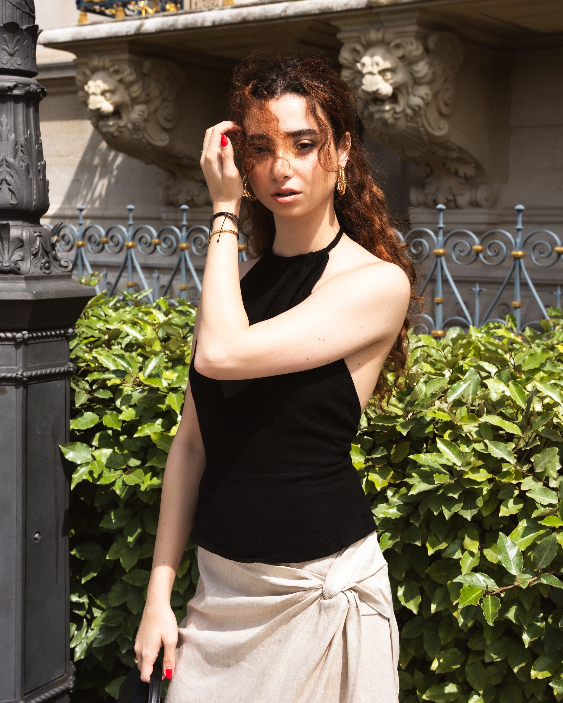 Minimalist in the front, statement in the back. This open-back top features a clean, high neckline, contrasted by a daring open back with delicate tie detailing.