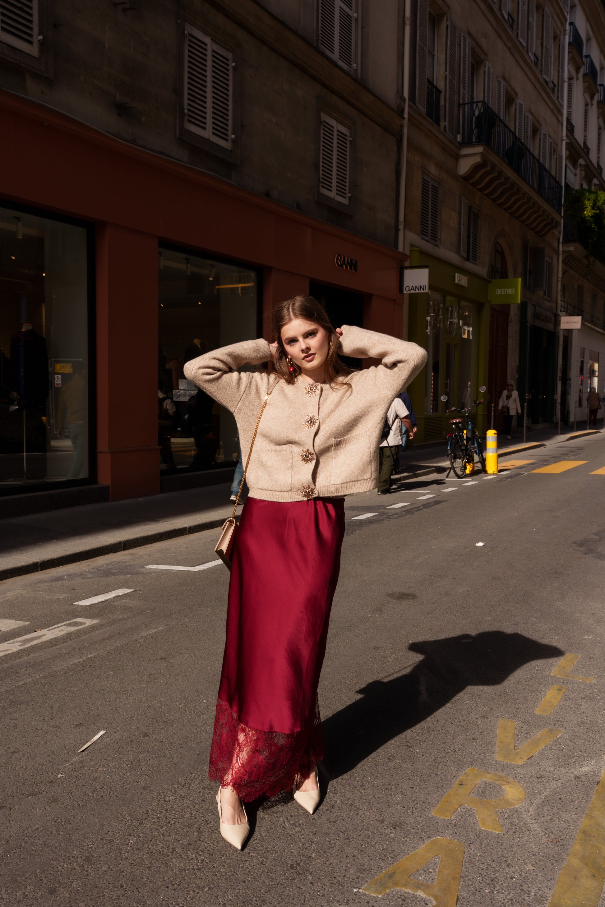Make an elegant statement with our crimson satin midi skirt, finished with an intricate lace hem for a touch of romance.