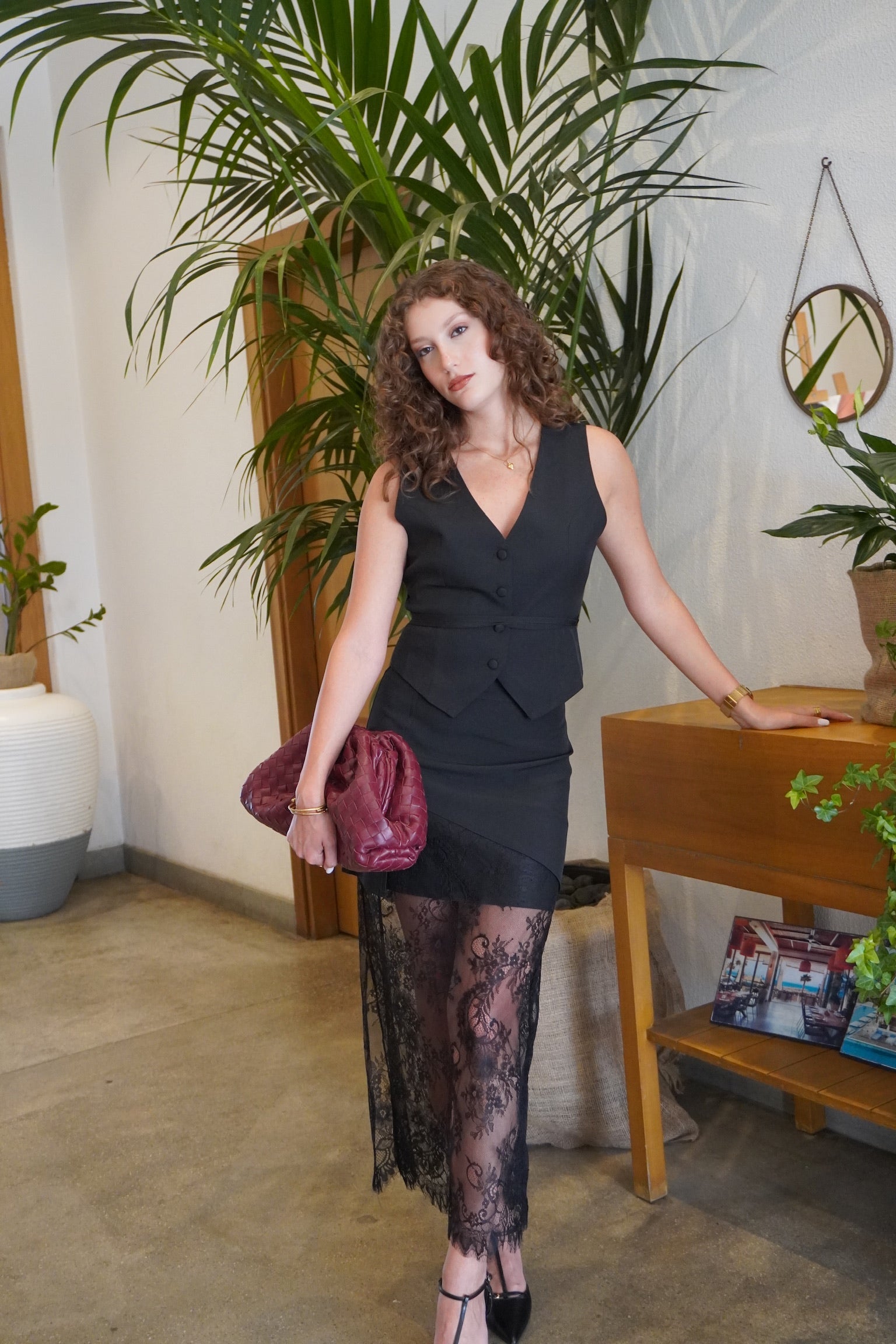 This sleeveless vest is crafted from a lightweight, breathable fabric and cinched at the waist with a matching belt